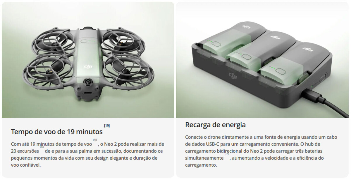 O lançamento do Neo 2 acontece em quatro combos diferentes, o mais simples apenas com o drone, outro Fly More só com o drone, o hub e três baterias, um Fly More que traz o drone, o controle sem tela RC-N3, hub de carregamento, 3 baterias, módulo de controle de longa distância e alguns acessórios, e um terceiro combo para controle em modo FPV, que traz o controle DJI RC Motion 3 e o óculos DJI Goggles N3.