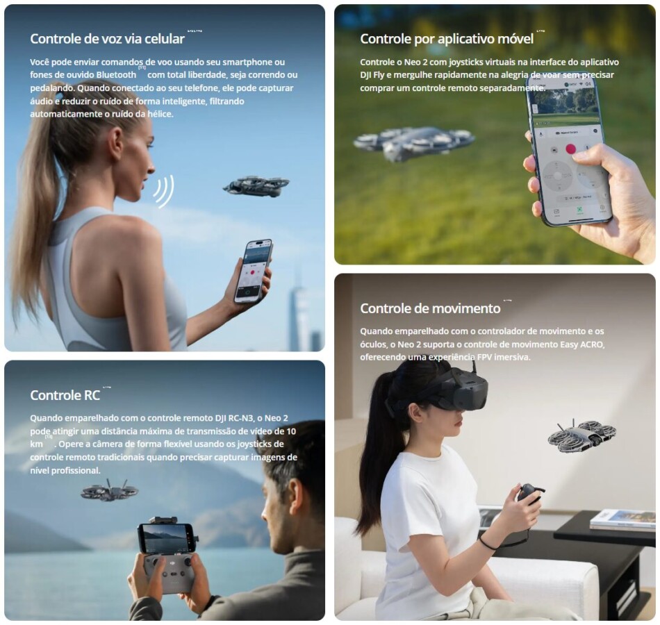 Outro ponto muito legal do DJI Neo 2 é a possibilidade de controlar o drone com controles e óculos FPV, sendo compatível com os mesmos dispositivos já suportados pelo Neo.