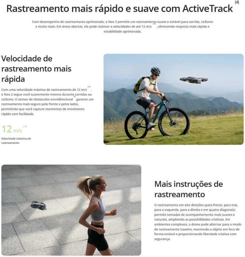 Mas o que mais chama atenção é o ActiveTrack 6.0, leia-se função seguir. Esse modo, agora com ajuda de sensores onidirecionais, faz o drone seguir um alvo se desviando de obstáculos em qualquer direção, uma grande evolução sobre o Neo de primeira geração que só detecta obstáculos na parte de frente.