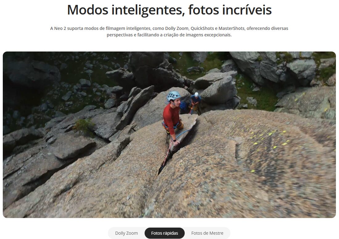 Em relação as funções automáticas fica o destaque para os modos QuickShots, que geram takes elaborados de forma simples e rápida. Esses modos são ideais para uso em viagens.