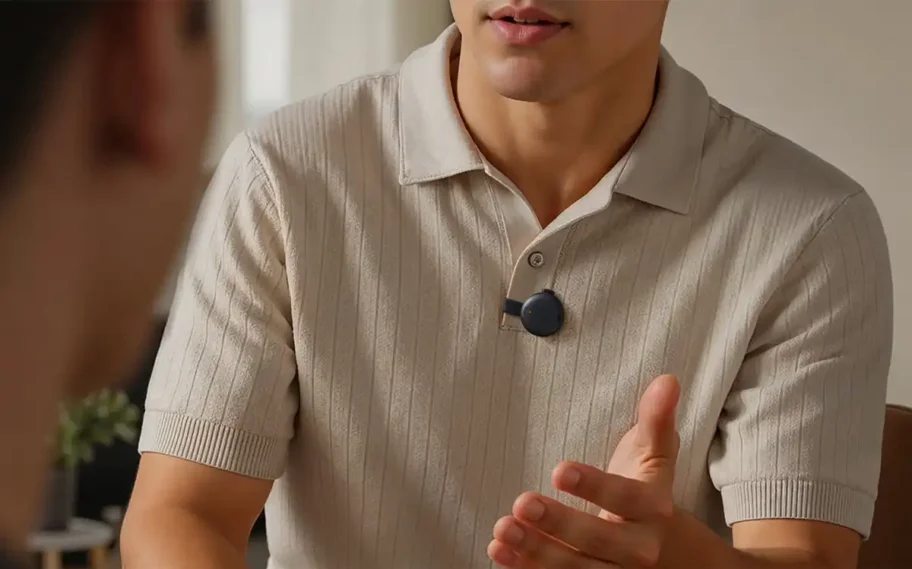 O design discreto permite que o Soundcore Work seja usado de diversas formas. O dispositivo pode ser acoplado a um cordão tipo colar ou fixado em roupas através de um clipe magnético incluído na embalagem. Essa versatilidade torna o gravador praticamente imperceptível durante o uso, ideal para profissionais que participam de múltiplas reuniões ao longo do dia ou estudantes que assistem aulas presenciais.