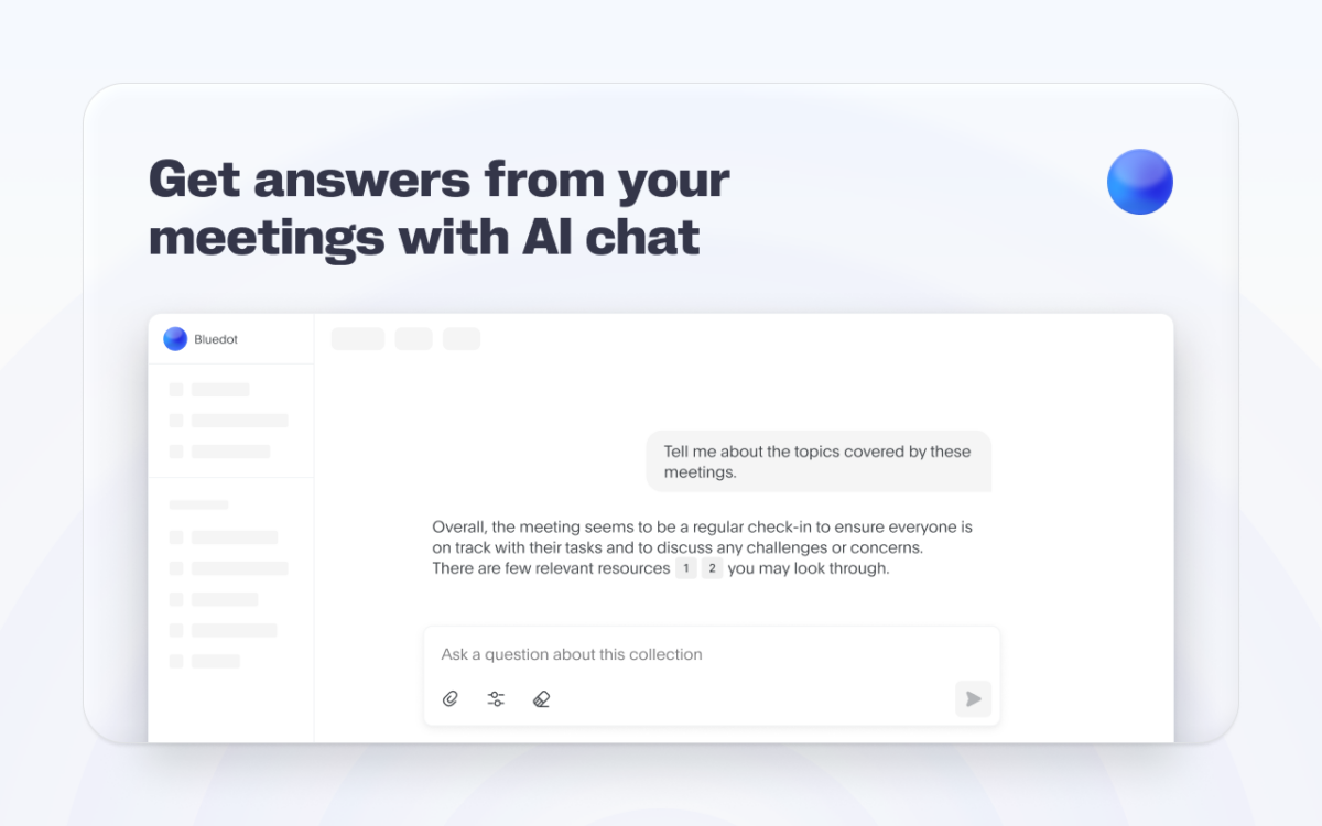 Com a adoção do trabalho remoto, Bluedot conquistou corações ao registrar reuniões, transcrever conversas e organizar automaticamente decisões, tópicos e tarefas discutidas. A extensão foi adotada por equipes que buscavam rastreabilidade e clareza após encontros virtuais.