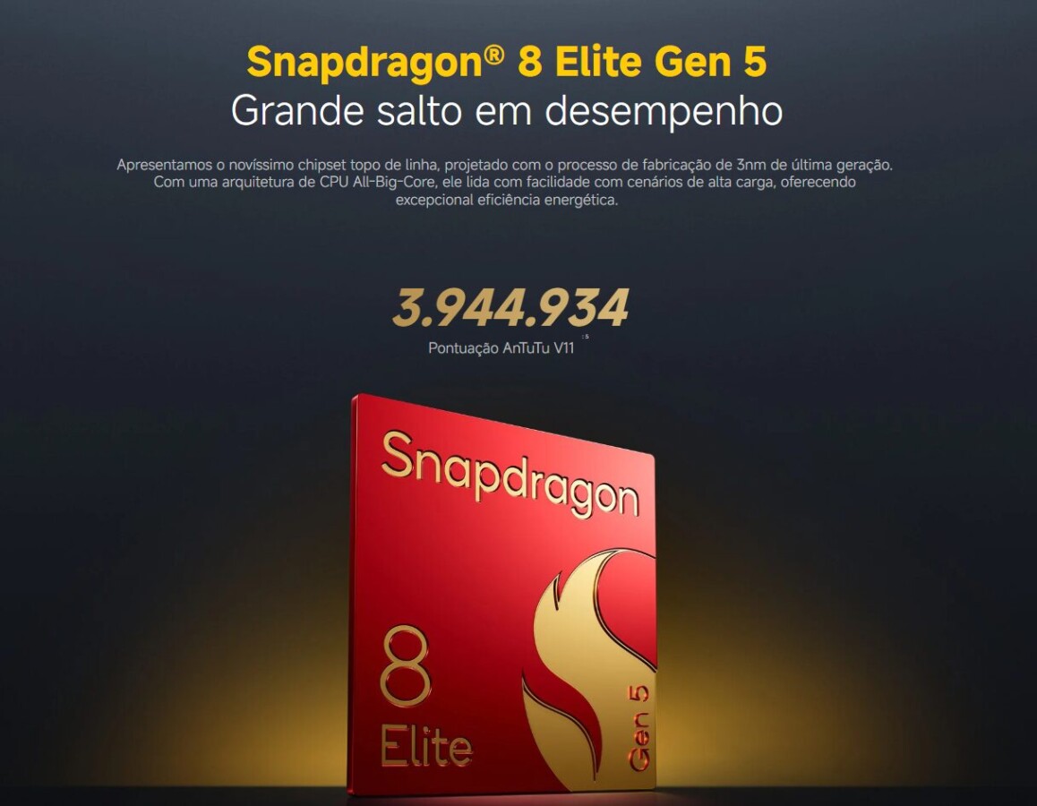 | Processador | Snapdragon 8 Elite (3 nm) • CPU octa-core até 4,32 GHz • GPU Adreno • Qualcomm AI Engine | Snapdragon 8 Elite Gen 5 (3 nm) • CPU octa-core até 4,6 GHz • GPU Adreno • Qualcomm AI Engine |