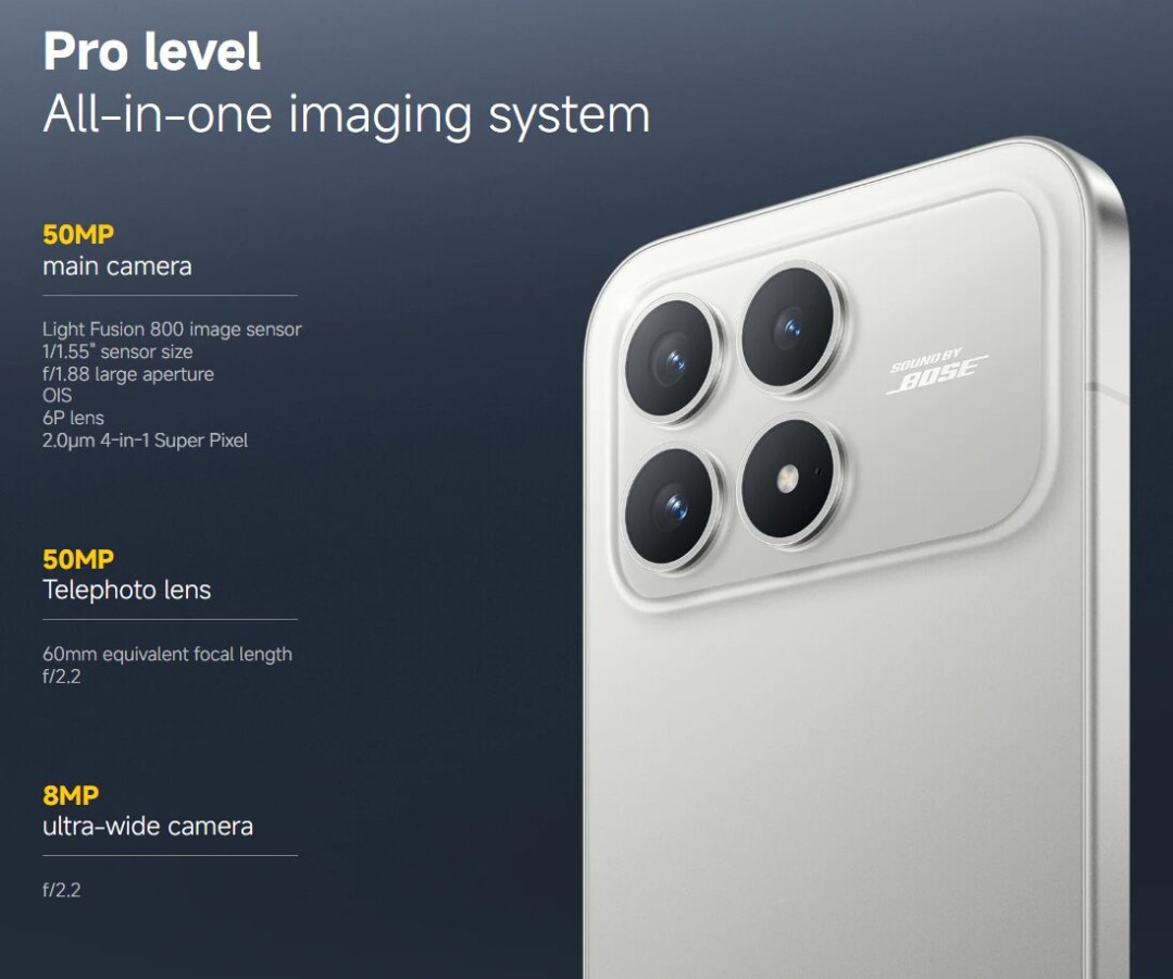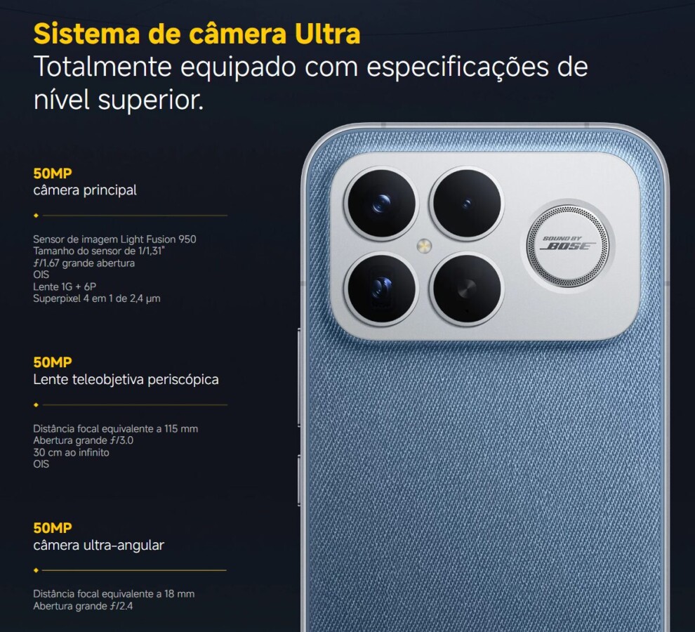 O POCO F8 Ultra ainda adota um acabamento em tecido na parte traseira e integra um alto-falante adicional no módulo de câmeras, resultado da colaboração com a Bose para criar um sistema de som estéreo 2.1 que amplifica graves.